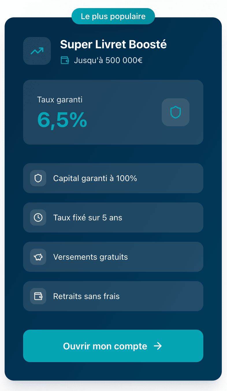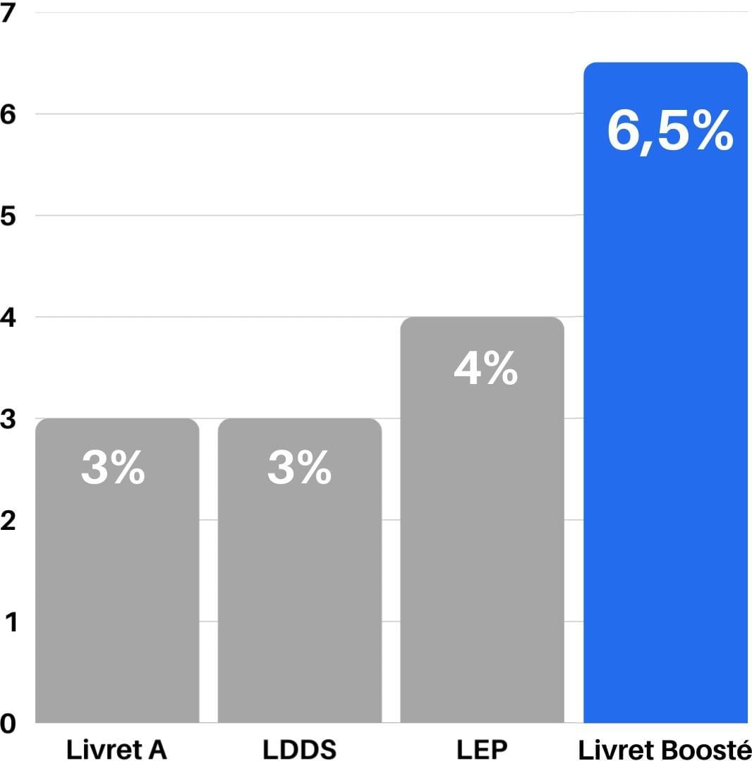 👉 Le Super livret boosté "Haut Rendement" vous offre une alternative révolutionnaire pour maximiser vos investissements à moyen terme. Avec un taux annuel de 6,5%, bien au-dessus des livrets traditionnels, il combine flexibilité et performance, idéal pour ceux qui cherchent à dynamiser leur épargne.
