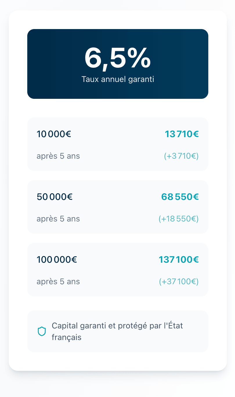 Un taux fixe de 6,5% sur 5 ans : votre argent travaille enfin efficacement pour vous.
